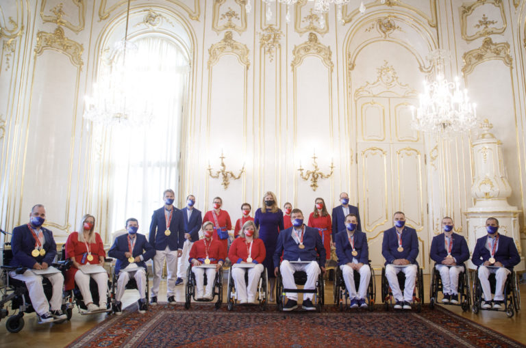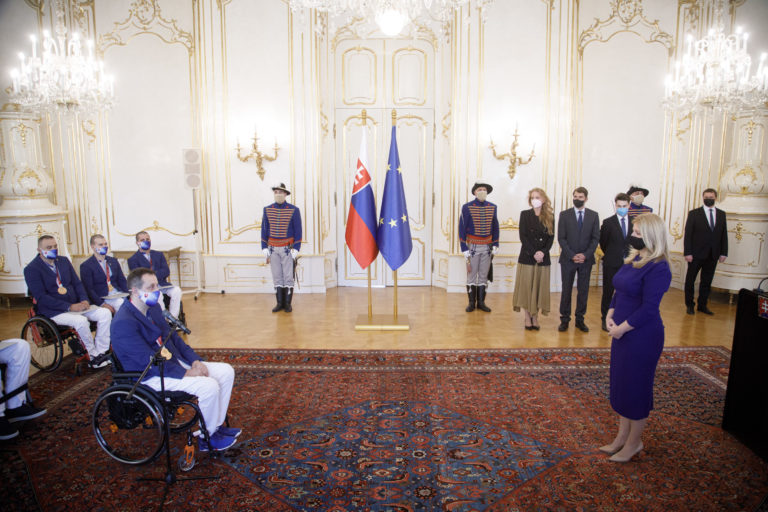 Prezidentka SR Zuzana Čaputová (deviata sprava) počas prijatia členov slovenskej paralympijskej výpravy, ktorí získali medaily na XVI. letných paralympijských hrách v Tokiu. Bratislava, 10. september 2021. Foto: SITA/Branislav Bibel
