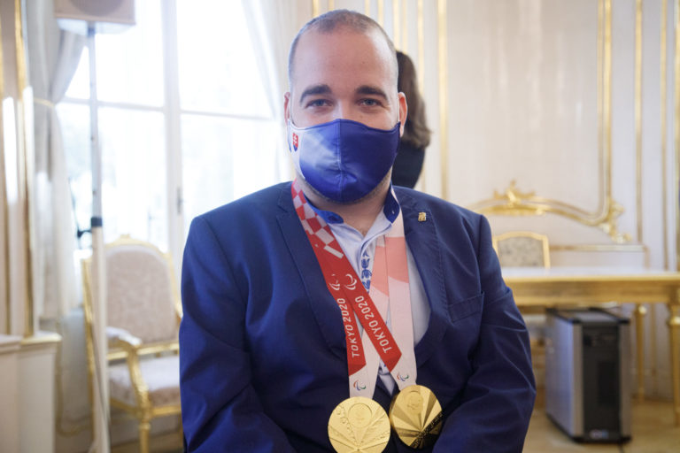 Slovenský paralympijský reprezentant v boccii Samuel Andrejčík počas prijatia členov slovenskej paralympijskej výpravy, ktorí získali medaily na XVI. letných paralympijských hrách v Tokiu prezidentkou SR v Prezidentskom paláci. Bratislava, 10. september 2021. Foto: SITA/Branislav Bibel