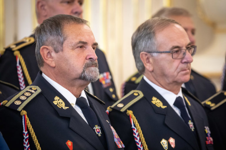 Prezident DPO SR Jozef Smolinský (vľavo) počas prijatia zástupcov Hasičského a záchranného zboru (HaZZ) a Dobrovoľnej požiarnej ochrany (DPO) SR v Prezidentskom paláci pri príležitosti 20. výročia Hasičského a záchranného zboru a 100. výročia dobrovoľného hasičstva. Bratislava, 12. október 2022. Foto: SITA/Diana Černáková