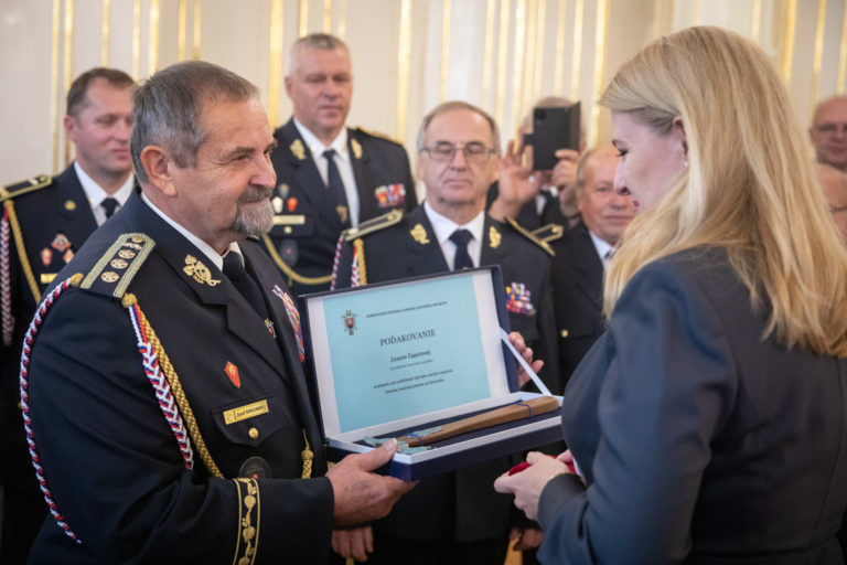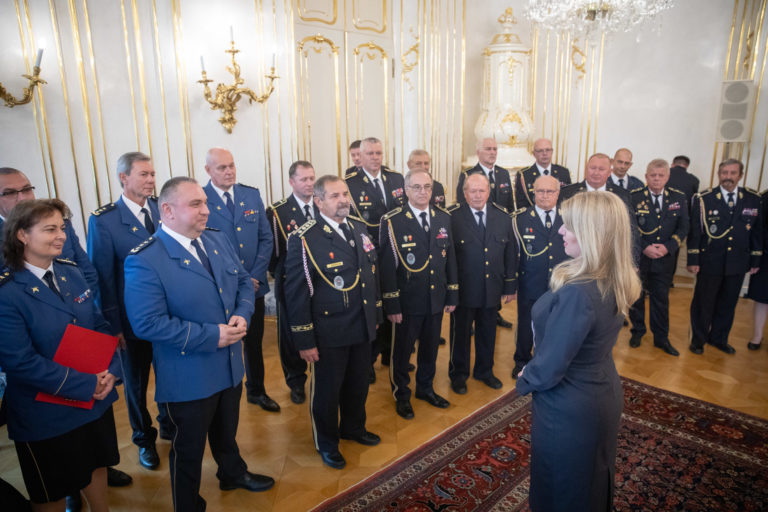 Prijatie zástupcov Hasičského a záchranného zboru (HaZZ) a Dobrovoľnej požiarnej ochrany (DPO) SR prezidentkou SR v Prezidentskom paláci pri príležitosti 20. výročia Hasičského a záchranného zboru a 100. výročia dobrovoľného hasičstva. Bratislava, 12. október 2022. Foto: SITA/Diana Černáková