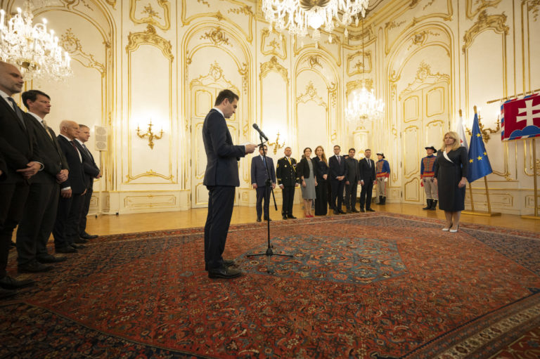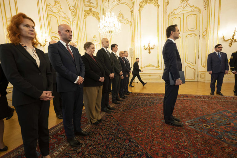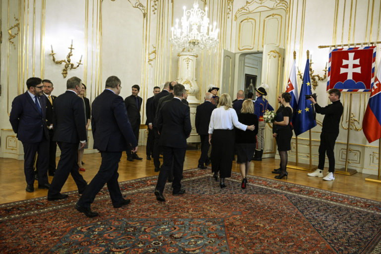 Dočasne poverený premiér SR Ľudovít Ódor (pravo v popredí) počas prijatia ministeriek a ministrov odchádzajúcej vlády odborníkov a premiéra Ľudovíta Ódora prezidentkou SR v Prezidentskom paláci. Bratislava, 24. október 2023. Foto: SITA/Milan Illík