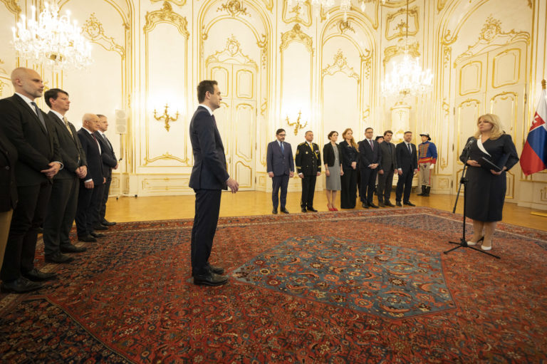 Prezidentka SR Zuzana Čaputová (vpravo) a dočasne poverený premiér SR Ľudovít Ódor (vľavo v popredí) počas prijatia ministeriek a ministrov odchádzajúcej vlády odborníkov a premiéra Ľudovíta Ódora v Prezidentskom paláci. Bratislava, 24. október 2023. Foto: SITA/Milan Illík