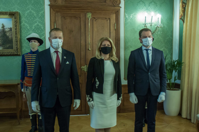 Premiér Igor Matovič, prezidentka Zuzana Čaputová a predseda parlamentu Boris Kollár pred začiatkom pracovných raňajok troch najvyšších činiteľov v Prezidentskom paláci. Bratislava, 4. september 2020. Foto: SITA/Ľudovít Vaniher.