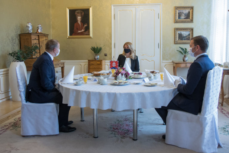 Prezidentka Zuzana Čaputová, premiér Igor Matovič a predseda parlamentu Boris Kollár počas pracovných raňajok troch najvyšších činiteľov v Prezidentskom paláci. Bratislava, 4. september 2020. Foto: SITA/Ľudovít Vaniher.