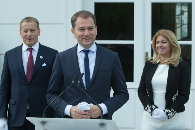 Prezidentka Zuzana Čaputová, predseda parlamentu Boris Kollár a premiér Igor Matovič počas brífingu po pracovných raňajkách troch najvyšších činiteľov v Prezidentskom paláci. Bratislava, 4. september 2020. Foto: SITA/Ľudovít Vaniher.
