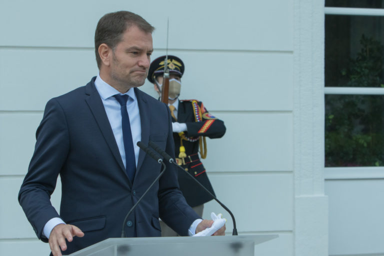 Premiér Igor Matovič počas brífingu po pracovných raňajkách troch najvyšších činiteľov v Prezidentskom paláci. Bratislava, 4. september 2020. Foto: SITA/Ľudovít Vaniher.