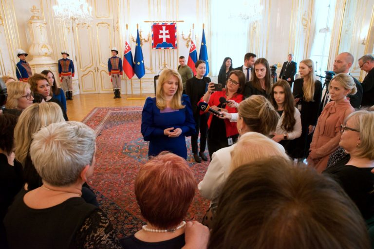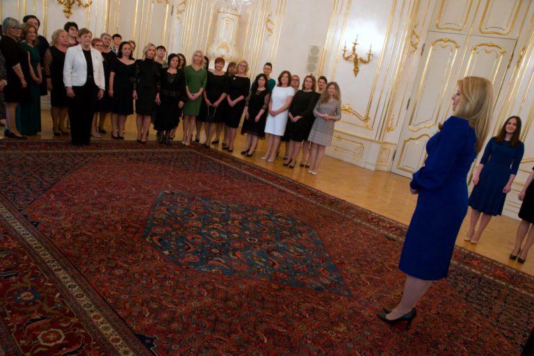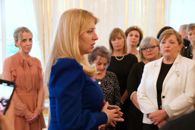 Prezidentka SR Zuzana Čaputová a zdravotné sestry ocenené Bielym srdcom. Foto: SITA/Jakub Julény