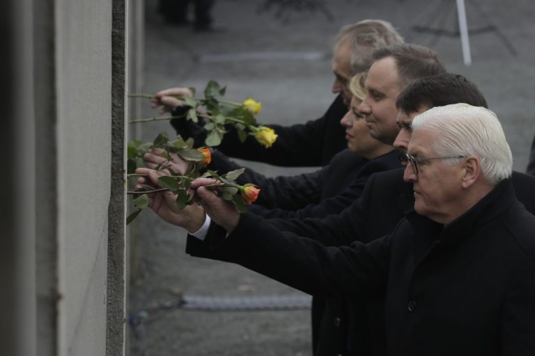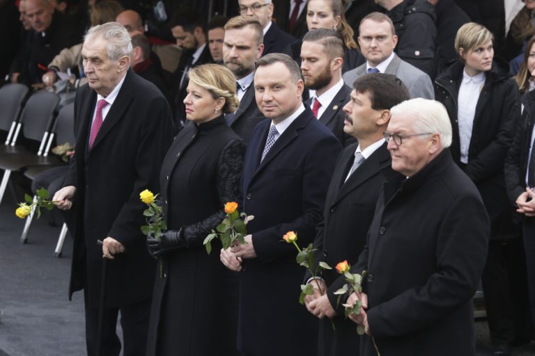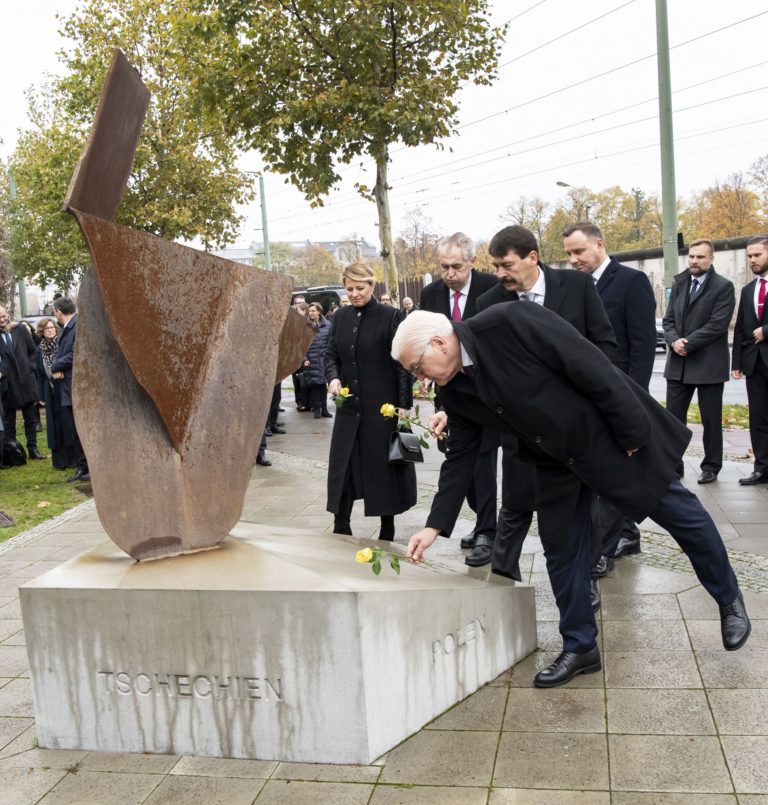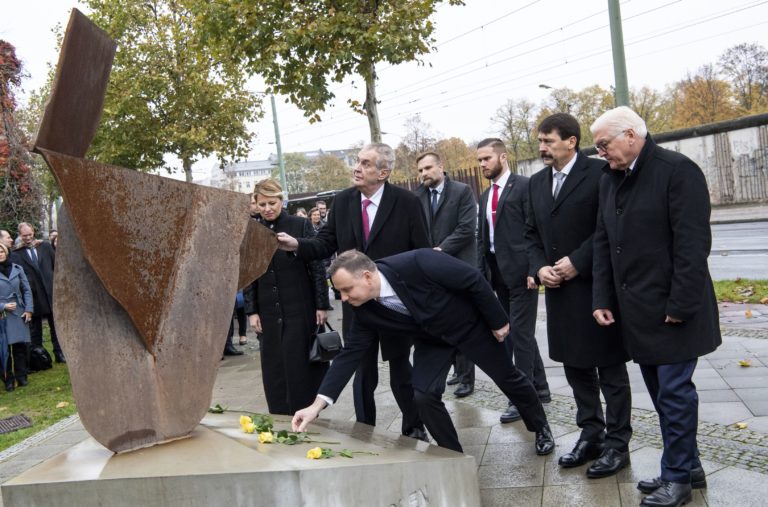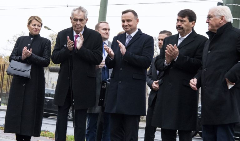 Slovenská prezidentka Zuzana Čaputová, český prezident Miloš Zeman, poľský prezident Andrzej Duda, maďarský prezidetn János Ader a nemecký prezident Frank Walter Steinmeier počas osláv 30. výročia pádu Berlínskeho múru. Berlín 9. november 2019 Foto: SITA/AP
