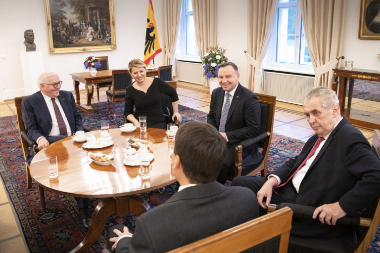 Zľava za stolom: Prezident Nemeckej spolkovej republiky Frank-Walter Steinmeier, prezidentka SR Zuzana Čaputová, prezident Poľskej republiky Andrzej Duda, prezident Českej republiky Miloš Zeman a prezident Maďarska Jánoš Áder počas stretnutia na Zámku Bellevue v Berlíne, pri príležitosti osláv 30.výročia pádu Berlínskeho múru. Berlín, 9. novemebr 2019. Foto: SITA/Kancelária prezidentky SR
