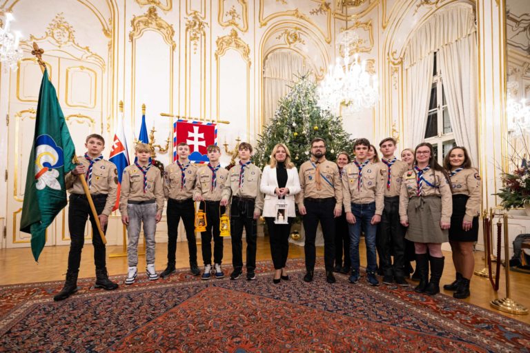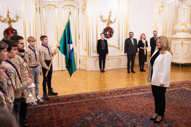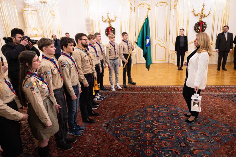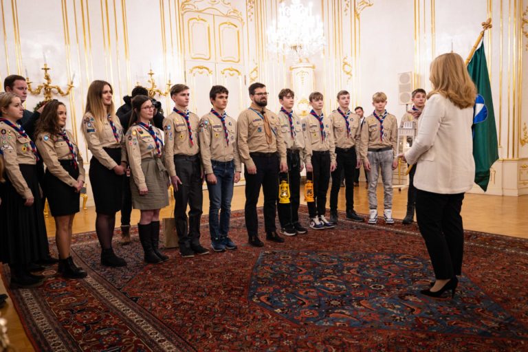 Prezidentka SR Zuzana Čaputová (šiesta zľava) počas prevzatia Betlehemského svetla od členov organizácie Slovenského skautingu v Prezidentskom paláci. Bratislava, 13. december 2022. Foto: SITA/Jana Birošová