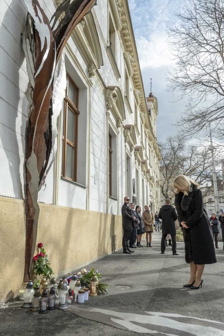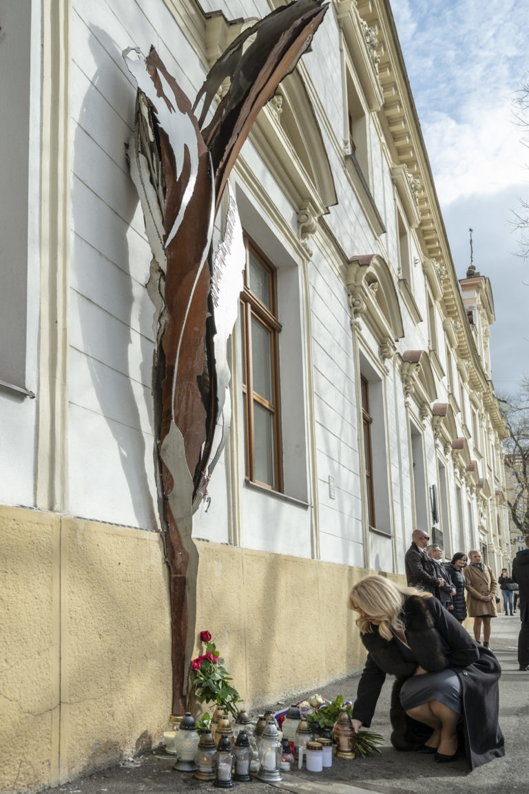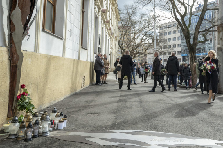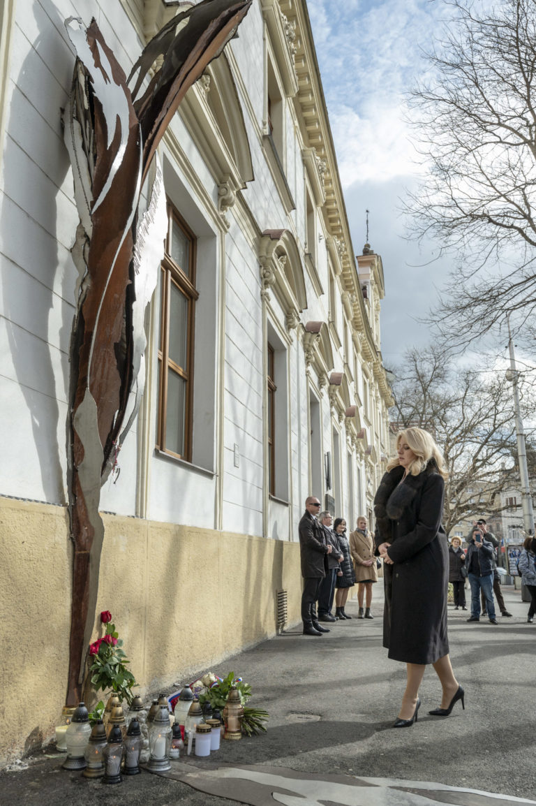 Prezidentka Zuzana Čaputová (v popredí) počas uctenia si pamiatky Jána Kuciaka a jeho snúbenice Martiny Kušnírovej položením kytice a zapálením sviečky pri pamätníku na Námestí SNP v Bratislave. Bratislava 21. február 2024. Foto: SITA/Milan Illík