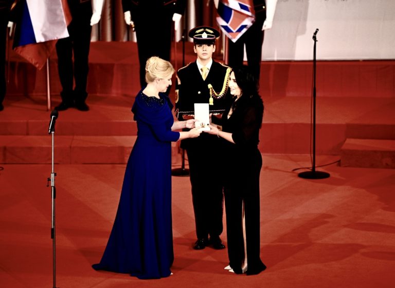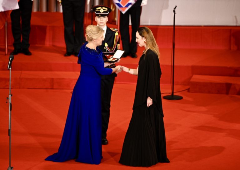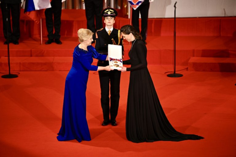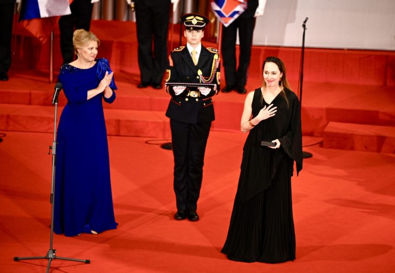 Prezidentka SR Zuzana Čaputová a baletka Nina Poláková, ktorej bol udelený Pribinov kríž I. triedy za mimoriadne zásluhy o kultúrny rozvoj Slovenskej republiky v oblasti klasického tanca, počas udeľovania štátnych vyznamenaní osobnostiam z rôznych oblastí spoločenského života pri príležitosti 31. výročia vzniku Slovenskej republiky. Bratislava, 14. január 2024. Foto: SITA/Milan Illík.