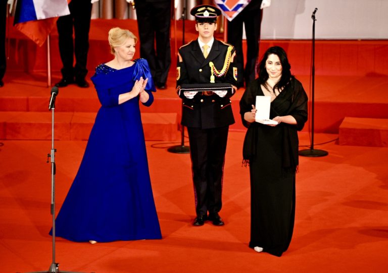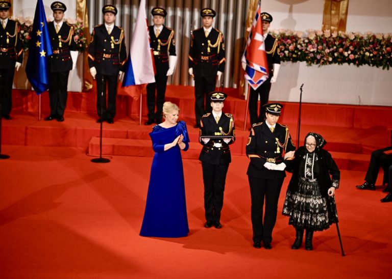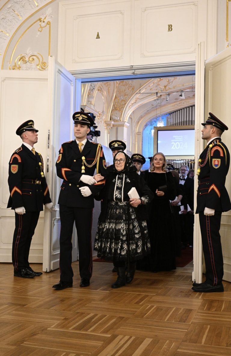 Insitná maliarka Eva Husáriková (uprostred), ktorej bola udelená Medaila prezidenta Slovenskej republiky za významné zásluhy o rozvoj kultúry a umenia zahraničných Slovákov, počas udeľovania štátnych vyznamenaní osobnostiam z rôznych oblastí spoločenského života pri príležitosti 31. výročia vzniku Slovenskej republiky. Bratislava, 14. január 2024. Foto: SITA/Milan Illík.