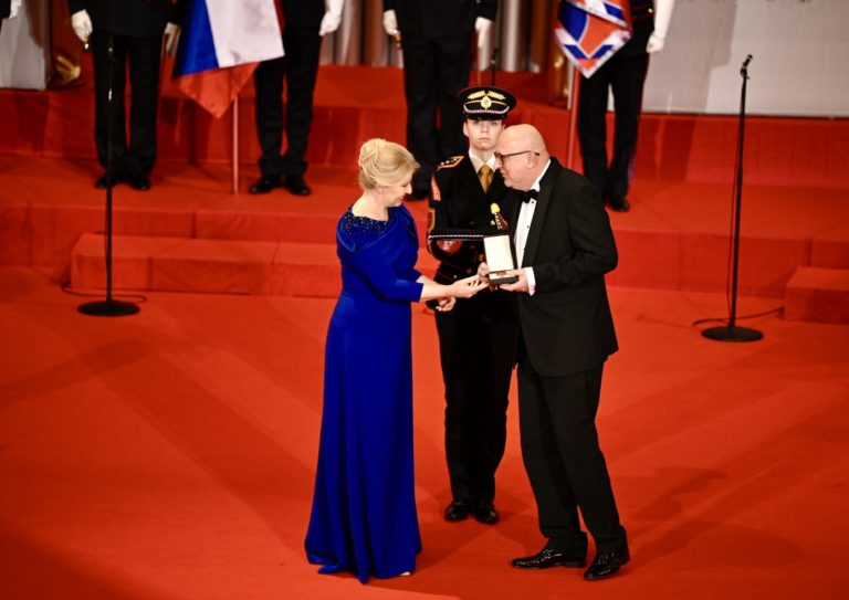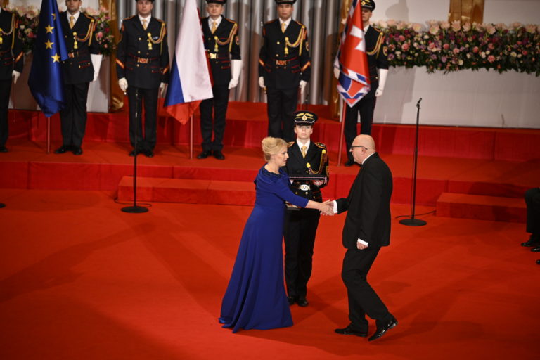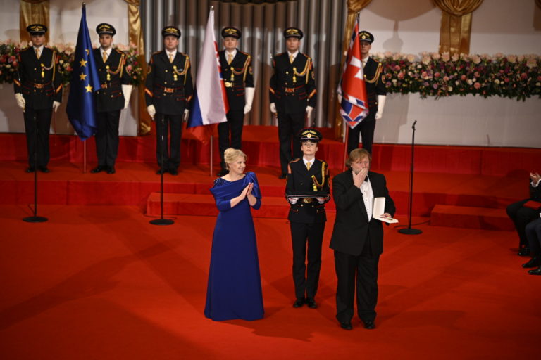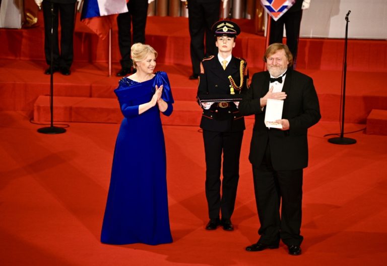 Zľava v popredí: Prezidentka SR Zuzana Čaputová a režisér Roman Polák, ktorému bol udelený Pribinov kríž I. triedy za mimoriadne zásluhy o kultúrny rozvoj Slovenskej republiky v oblasti divadla, počas udeľovania štátnych vyznamenaní osobnostiam z rôznych oblastí spoločenského života pri príležitosti 31. výročia vzniku Slovenskej republiky. Bratislava, 14. január 2024. Foto: SITA/Milan Illík.