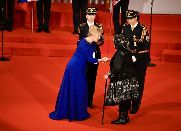 Zľava v popredí: Prezidentka SR Zuzana Čaputová a insitná maliarka Eva Husáriková, ktorej bola udelená Medaila prezidenta Slovenskej republiky za významné zásluhy o rozvoj kultúry a umenia zahraničných Slovákov, počas udeľovania štátnych vyznamenaní osobnostiam z rôznych oblastí spoločenského života pri príležitosti 31. výročia vzniku Slovenskej republiky. Bratislava, 14. január 2024. Foto: SITA/Milan Illík.