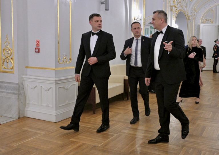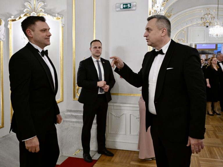 Zľava v popredí: Minister životného prostredia Tomáš Taraba a podpredseda NR SR Andrej Danko po ukončení udeľovania štátnych vyznamenaní osobnostiam z rôznych oblastí spoločenského života pri príležitosti 31. výročia vzniku Slovenskej republiky. Bratislava, 14. január 2024. Foto: SITA/Milan Illík.