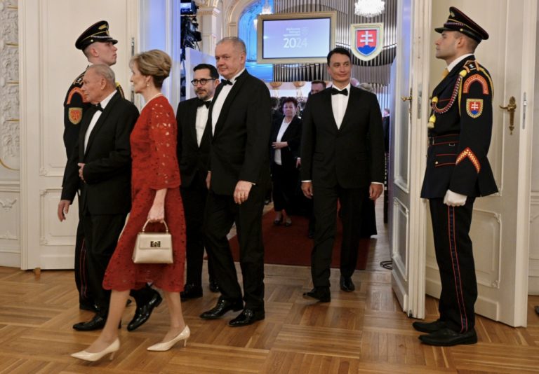 Bývalý prezident SR Andrej Kiska (uprostred) po ukončení udeľovania štátnych vyznamenaní osobnostiam z rôznych oblastí spoločenského života pri príležitosti 31. výročia vzniku Slovenskej republiky. Bratislava, 14. január 2024. Foto: SITA/Milan Illík.