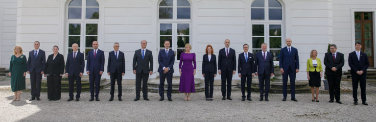 Sprava: Minister zdravotníctva SR Michal Palkovič, minister školstva, vedy, výskumu a športu Slovenskej republiky Daniel Bútora, ministerka práce, sociálnych vecí a rodiny SR Soňa Gaborčáková, minister investícií, regionálneho rozvoja a informatizácie SR Peter Balík, minister dopravy a výstavby SR Pavol Lančarič, minister hospodárstva SR Peter Dovhun, minister obrany SR Martin Sklenár, podpredsedníčka vlády SR pre Plán obnovy a odolnosti a využívanie eurofondov Lívia Vašáková, prezidentka SR Zuzana Čaputová, predseda vlády SR Ľudovít Ódor, minister zahraničných vecí a európskych záležitostí SR Miroslav Wlachovský, minister vnútra SR Ivan Šimko, minister financií SR Michal Horváth, minister pôdohospodárstva a rozvoja vidieka SR Jozef Bíreš, ministerka spravodlivosti SR Jana Dubovcová, minister životného prostredia Slovenskej republiky Milan Chrenko a ministerka kultúry Slovenskej republiky Silvia Hroncová na spoločnej fotografii po vymenovaní novej vlády odborníkov prezidentkou SR v Prezidentskom paláci. Bratislava, 15. máj 2023. Foto: SITA/ Diana Černáková