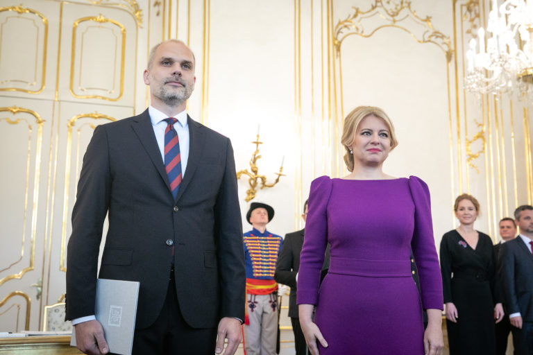 Sprava: Prezidentka SR Zuzana Čaputová a novovymenovaný minister zdravotníctva Slovenskej republiky Michal Palkovič počas vymenovania novej vlády odborníkov prezidentkou SR v Prezidentskom paláci. Bratislava, 15. máj 2023. Foto: SITA/ Diana Černáková