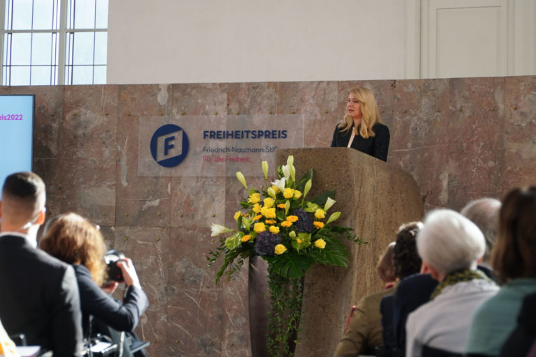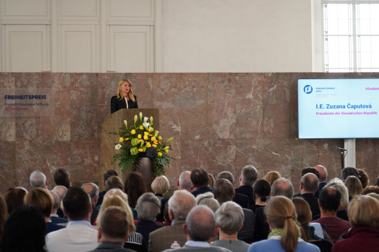 Prezidentka SR Zuzana Čaputová v príhovore získala Cenu slobody Nadácie Friedricha Naumanna (FNF), ktorú si prevzala vo Franfurte nad Mohanom v Nemecku. Bratislava, 5. november 2022. Foto: SITA/Kancelária prezidenta