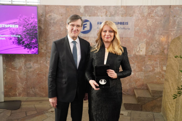 Prezidentka SR Zuzana Čaputová s Cenou slobody Nadácie Friedricha Naumanna (FNF), ktorú si prevzala vo Franfurte nad Mohanom v Nemecku. Bratislava, 5. november 2022. Foto: SITA/Kancelária prezidenta