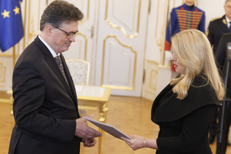 Zľava: Novovymenovaný minister školstva, vedy, výskumu a športu SR Ján Horecký a prezidentka SR Zuzana Čaputová počas vymenovania ministra školstva, vedy, výskumu a športu SR do funkcie prezidentkou SR v Prezidentskom paláci. Bratislava, 4. október 2022. Foto: SITA/Branislav Bibel