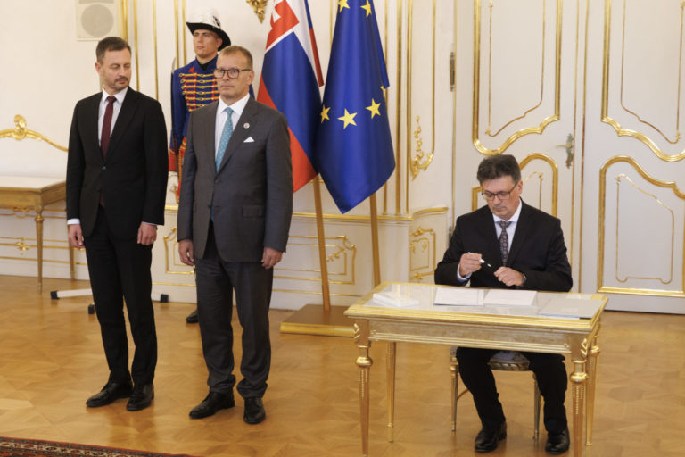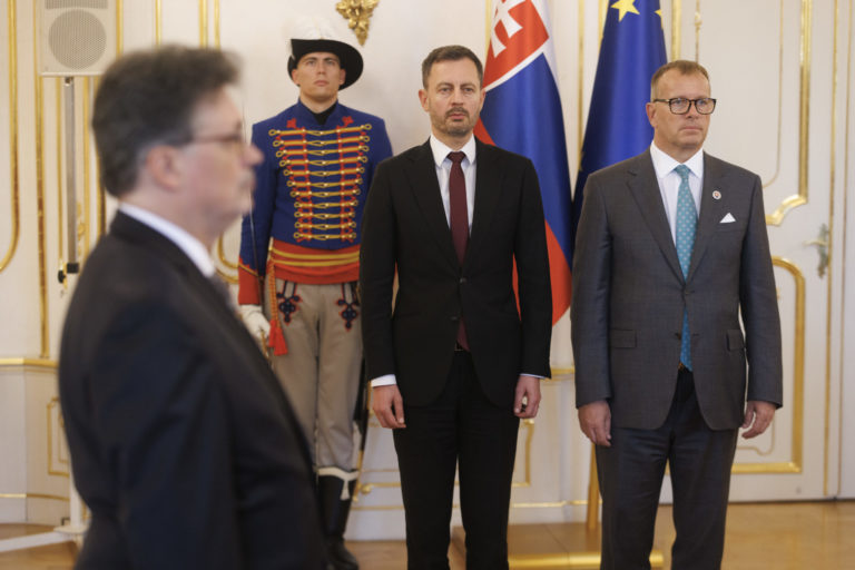 Sprava v popredí: Novovymenovaný minister školstva, vedy, výskumu a športu SR Ján Horecký, predseda NR SR Boris Kollár a predseda vlády SR Eduard Heger počas vymenovania ministra školstva, vedy, výskumu a športu SR do funkcie prezidentkou SR v Prezidentskom paláci. Bratislava, 4. október 2022. Foto: SITA/Branislav Bibel