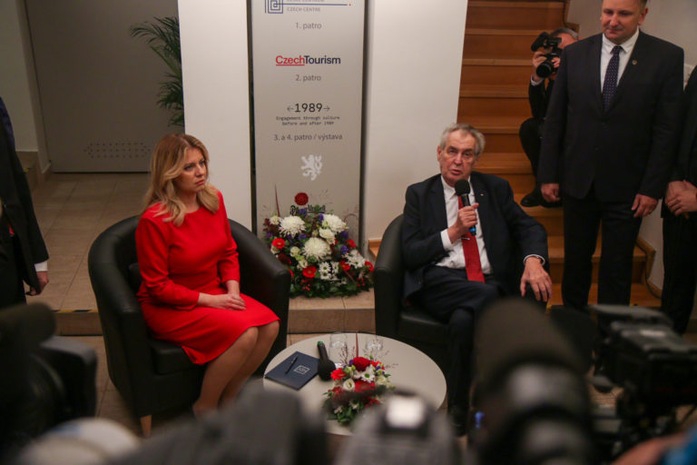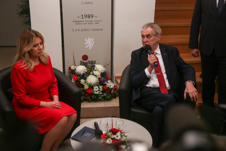 Zľava: Prezidentka SR Zuzana Čaputová a prezident ČR Miloš Zeman počas otvorenia Českého domu v centre Bratislavy. Bratislava, 16. november 2019. Foto: SITA/Alexandra Čunderlíková