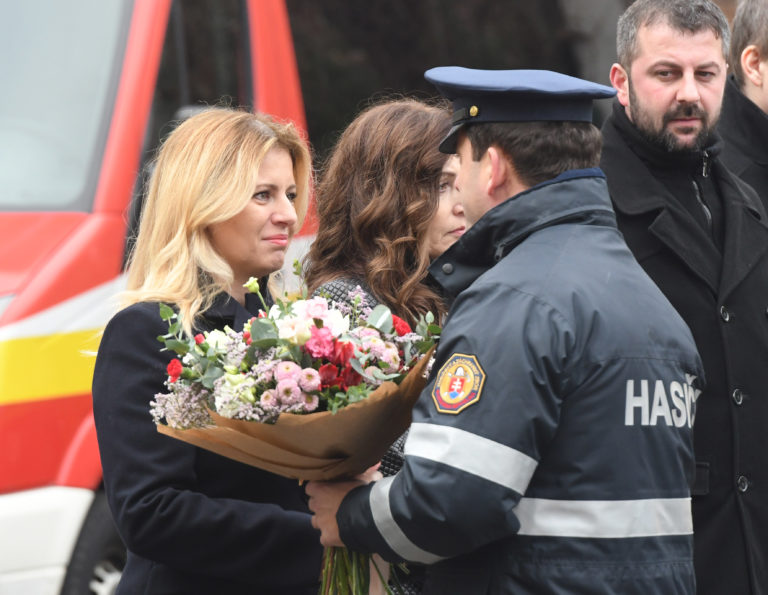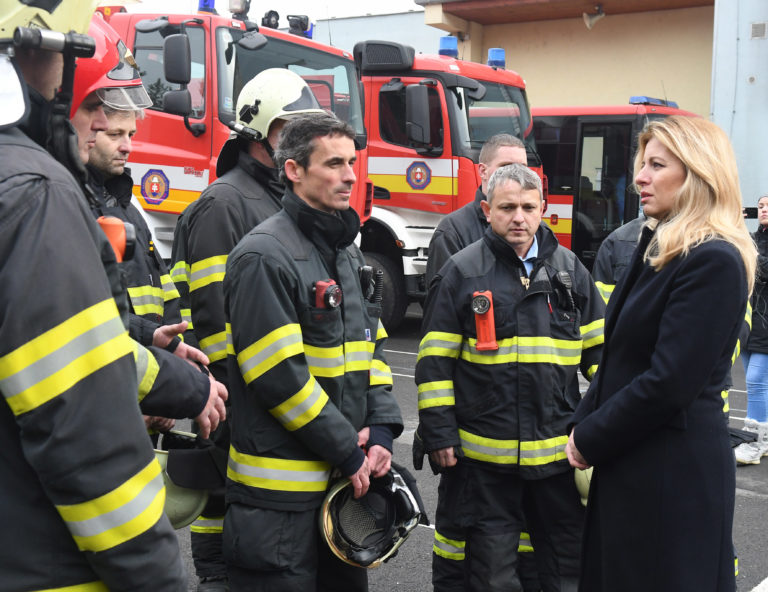 Prezidentka SR Zuzana Čaputová a príslušníci Krajského riaditeľstva HaZZ v Prešove počas ich stretnutia v rámci návštevy Prešova, aby osobne vyjadrila svoju podporu obyvateľom mesta po nedávnej tragédii na Mukačevskej ulici. Prešov, 16. december 2019. Foto: SITA/Viktor Zamborský
