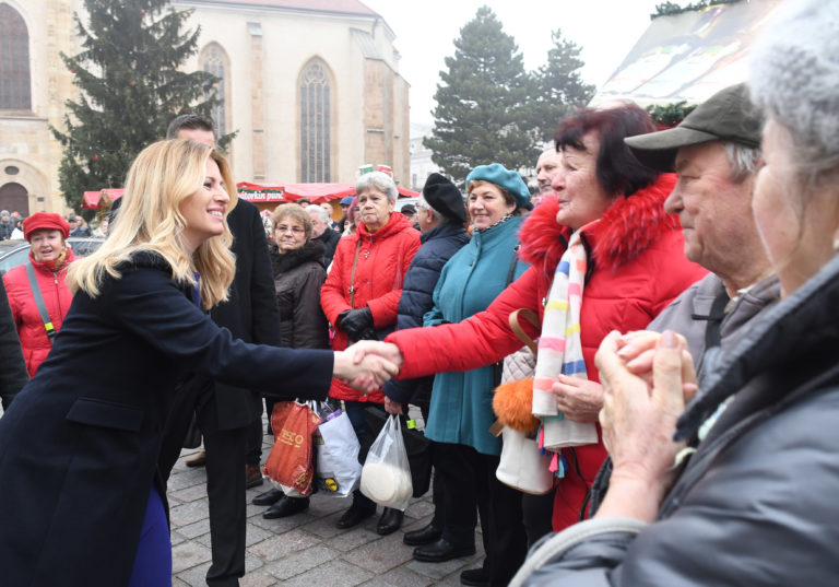 Zuzana Čaputová sa víta s občanmi Prešova počas príchodu pred budovou radnice v Prešove pri príležitosti stretnutia prezidentky SR s vedením mesta. Prešov, 16. december 2019. Foto: SITA/Viktor Zamborský