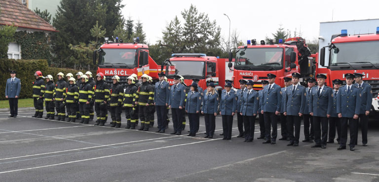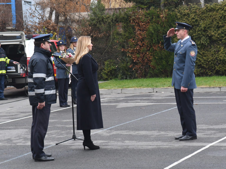 Nastúpení príslušníci HaZZ v Prešove počas stretnutia prezidentky SR s príslušníkmi Krajského riaditeľstva Hasičského a záchranného zboru v rámci prezidentkinej návštevy Prešova, aby osobne vyjadrila svoju podporu obyvateľom mesta po nedávnej tragédii na Mukačevskej ulici. Prešov, 16. december 2019. Foto: SITA/Viktor Zamborský