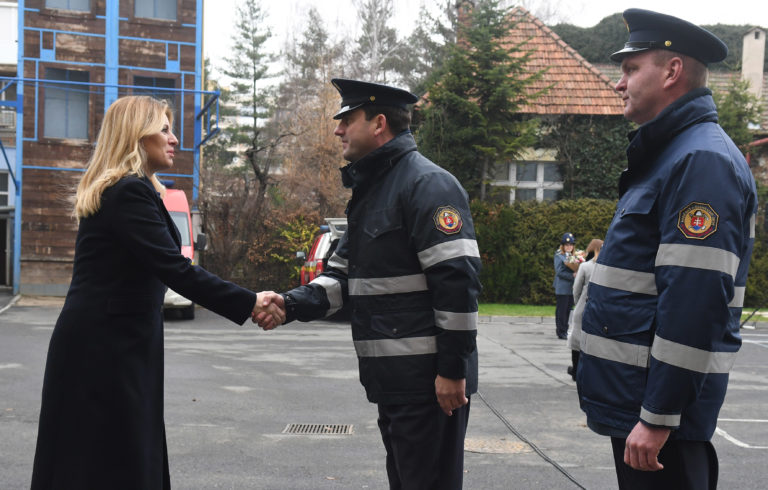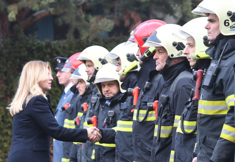 Prezidentka SR Zuzana Čaputová sa zdraví s príslušníkmi Krajského riaditeľstva Hasičského a záchranného zboru v Prešove počas ich stretnutia v rámci návštevy Prešova, aby osobne vyjadrila svoju podporu obyvateľom mesta po nedávnej tragédii na Mukačevskej ulici. Prešov, 16. december 2019. Foto: SITA/Viktor Zamborský