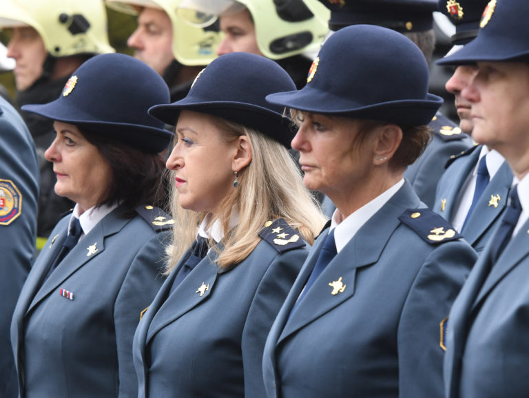 Príslušníčky Hasičského zboru a záchranného zboru počas stretnutia prezidentky SR s príslušníkmi Krajského riaditeľstva Hasičského a záchranného zboru v Prešove v rámci návštevy Prešova, aby osobne vyjadrila svoju podporu obyvateľom mesta po nedávnej tragédii na Mukačevskej ulici. Prešov, 16. december 2019. Foto: SITA/Viktor Zamborský
