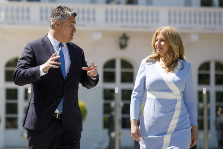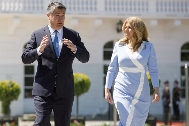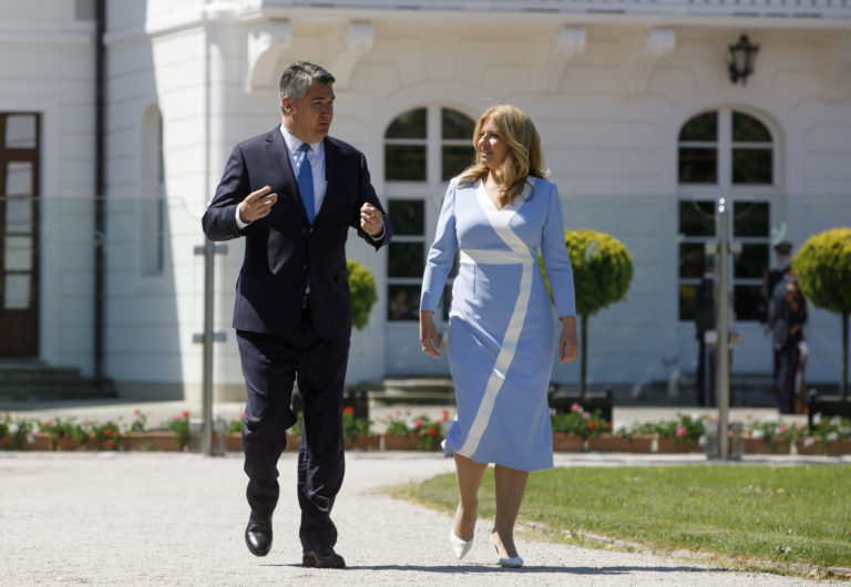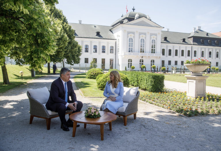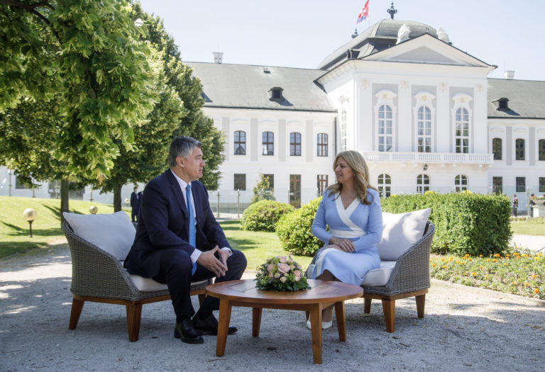 Zľava: Prezident Chorvátskej republiky Zoran Milanović a prezidentka Slovenkej republiky Zuzana Čaputová počas prijatia chorvátskeho prezidenta prezidentkou Slovenska v Prezidentskej záhrade. Bratislava, 15.jún 2021. Foto: SITA/Branislav Bibel