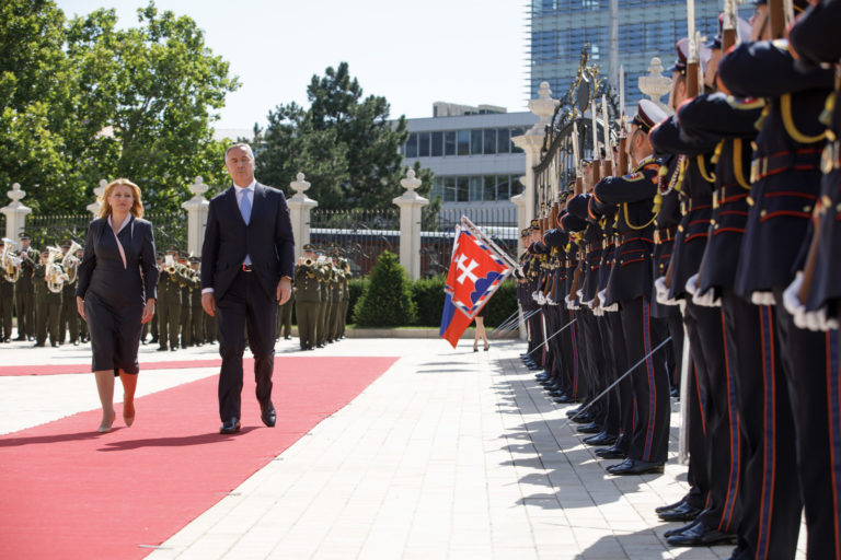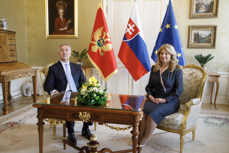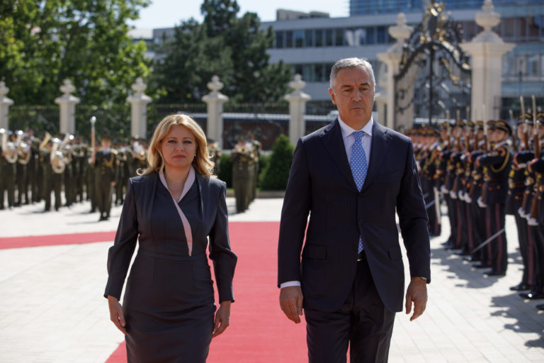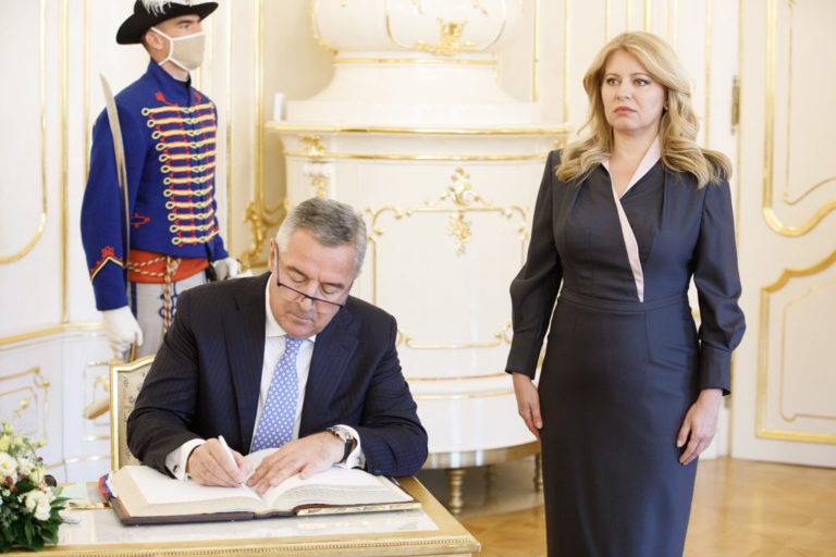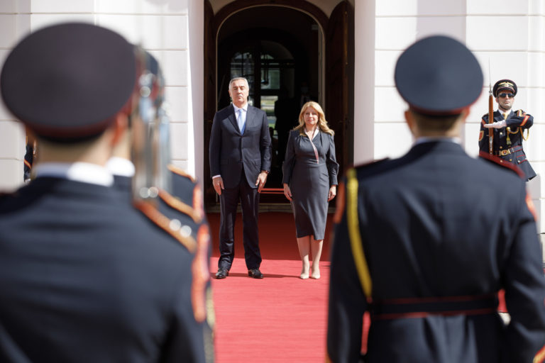Zľava: Prezidentka SR Zuzana Čaputová a prezident Čiernej Hory Milo Djukanovič počas prijatia prezidenta Čiernej Hory prezidentkou Slovenskej republiky v Prezidentskom paláci. Bratislava, 15. júl 2021. Foto: SITA/Branislav Bibel