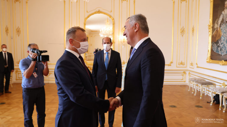 Zľava: Prezident Čiernej Hory Milo Djukanovič a predseda Národnej rady SR Boris Kollár počas prijatia prezidenta Čiernej Hory predsedom parlamentu v priestoroch Bratislavského hradu. Bratislava, 15. júl 2021. Foto: SITA/Kancelária NR SR