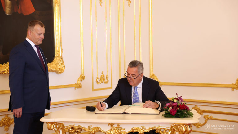 Sprava v popredí: Prezident Čiernej Hory Milo Djukanovič a predseda Národnej rady SR Boris Kollár počas prijatia prezidenta Čiernej Hory predsedom parlamentu v priestoroch Bratislavského hradu. Bratislava, 15. júl 2021. Foto: SITA/Kancelária NR SR