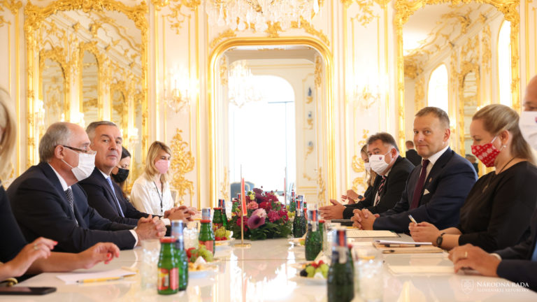 Prezident Čiernej Hory Milo Djukanovič (tretí zľava) a predseda Národnej rady SR Boris Kollár (tretí sprava) počas prijatia prezidenta Čiernej Hory predsedom parlamentu v priestoroch Bratislavského hradu. Bratislava, 15. júl 2021. Foto: SITA/Kancelária NR SR