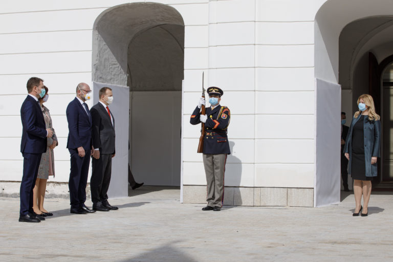 Zľava: Predseda strany SAS Richard Sulík, predseda hnutia OĽANO Igor Matovič, prezidentka SR Zuzana Čaputová, podpredsedníčka strany Za ľudí Veronika Remišová a predseda hnutia Sme rodina Boris Kollár Foto: SITA/Branislav Bibel