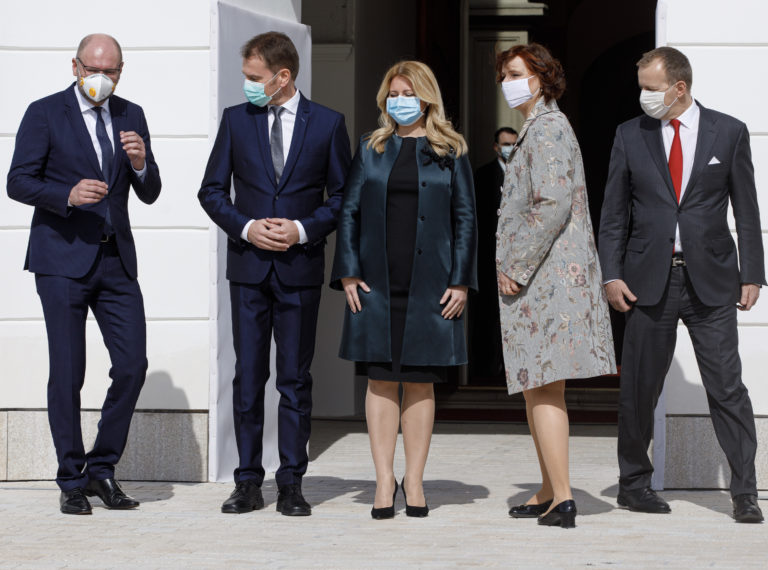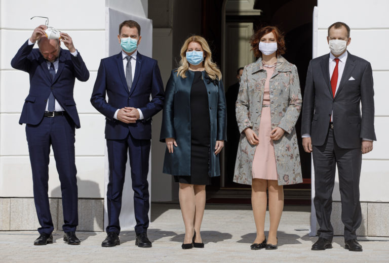 Zľava: Predseda hnutia OĽANO Igor Matovič, podpredsedníčka strany Za ľudí Veronika Remišová, predseda strany SAS Richard Sulík, predseda hnutia Sme rodina Boris Kollár a prezidentka SR Zuzana Čaputová (vpravo) počas stretnutia prezidentky SR s lídrami politických strán budúcej vládnej štvorkoalície v Prezidentskom paláci. Bratislava, 14. marec 2020. Foto: SITA/Branislav Bibel