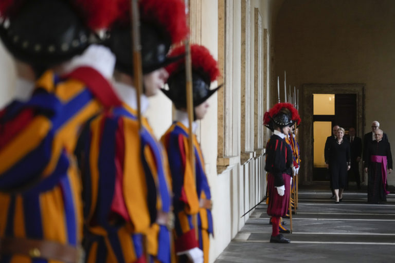 Prezidentka Slovenska Zuzana Čaputová prechádza okolo Švajčiarskej gardy pri príchode na nádvorie Sv. Damaso pred stretnutím s pápežom Františkom vo Vatikáne. 10. december 2022 Foto: SITA/AP