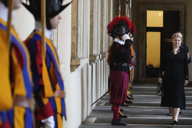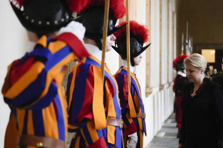 Prezidentka Slovenska Zuzana Čaputová prechádza okolo švajčiarskych gardistov pri príchode na nádvorie St. Damaso pred stretnutím s pápežom Františkom vo Vatikáne. 10. december 2022 Foto: SITA/AP