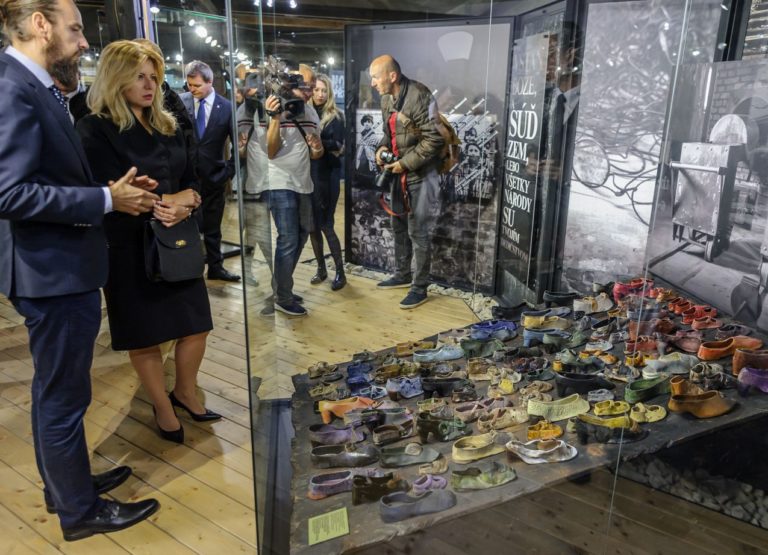 Zľava: Riaditeľ Múzea holokaustu v Seredi Martin Korčok a prezidentka SR Zuzana Čaputová počas návštevy Múzea holokaustu v Seredi počas prehliadky expozície Barak č. 3 pri príležitosti pietnej spomienky Stretnutie generácií v Múzeu holokaustu v Seredi za účasti 20 preživších holokaust, pôvodom zo Slovenska a 400 žiakov a študentov zo Slovenska. Sereď, 9. september 2019. Foto: archívne, SITA/Martin Havran