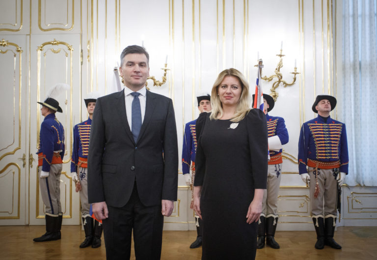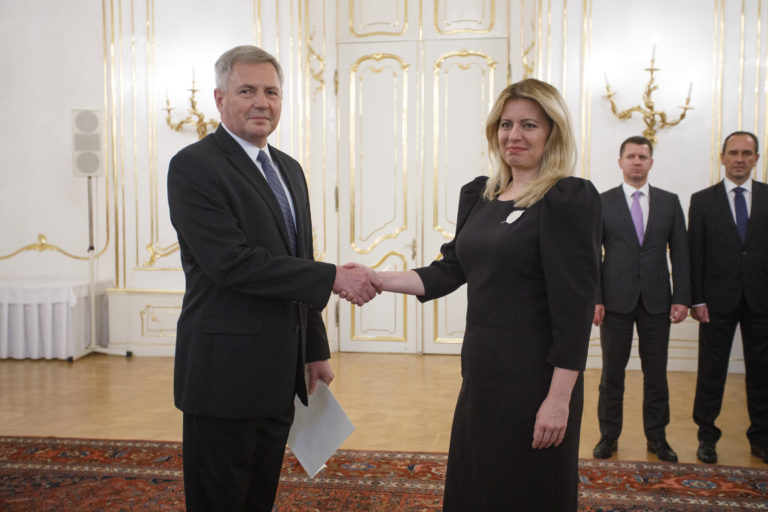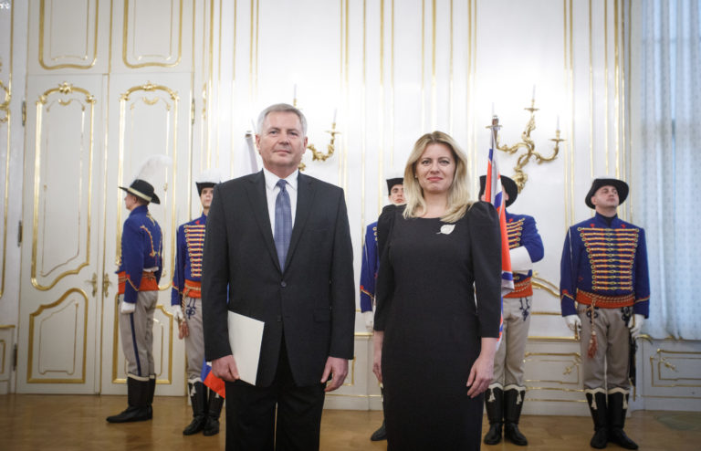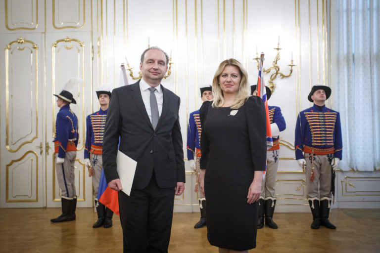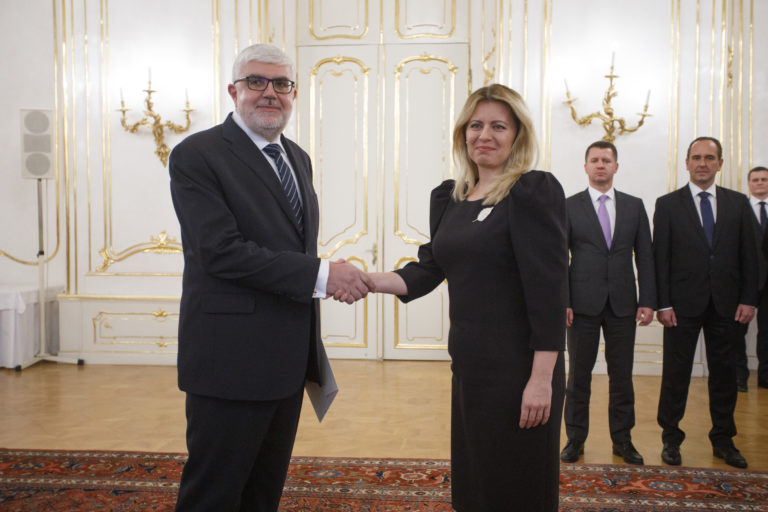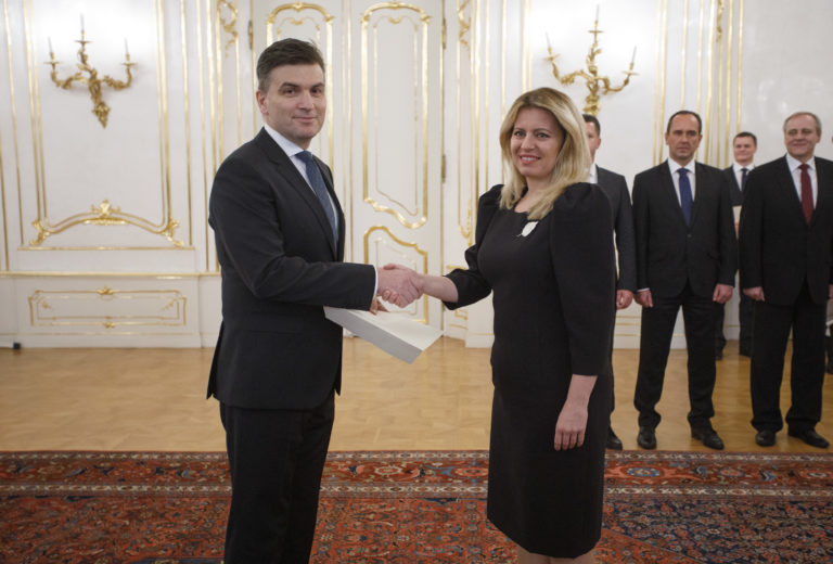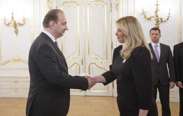 Zľava: Veľvyslanec SR pre Gruzínsko Pavel Vízdal a prezidentka SR Zuzana Čaputová počas odovzdávania poverovacích listín prezidentkou SR veľvyslancom SR v zahraničí. Bratislava, 20. november 2019. Foto: SITA/Branislav Bibel