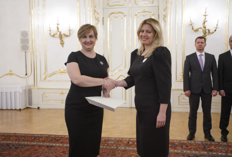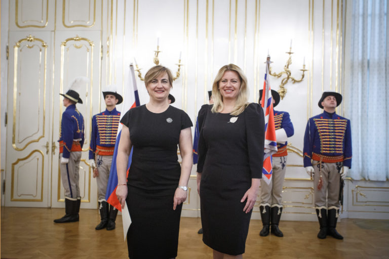 Zľava: Veľvyslankyňa SR pre Mexiko Terézia Šajgalíková a prezidentka SR Zuzana Čaputová počas odovzdávania poverovacích listín prezidentkou SR veľvyslancom SR v zahraničí. Bratislava, 20. november 2019. Foto: SITA/Branislav Bibel