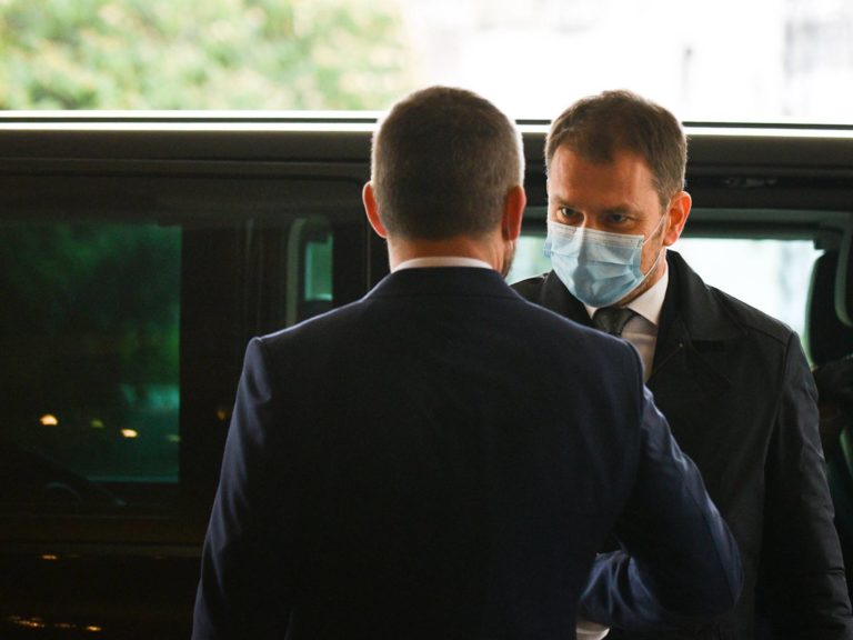 Zľava: Bývalý premiér SR Peter Pellegrini a novovymenovaný predseda vlády SR Igor Matovič pred oficiálnym odovzdaním Úradu vlády novovymenovanému predsedovi vlády SR v starej budove Úradu vlády SR. Bratislava, 21. marec 2020. Foto: SITA/Martin Medňanský