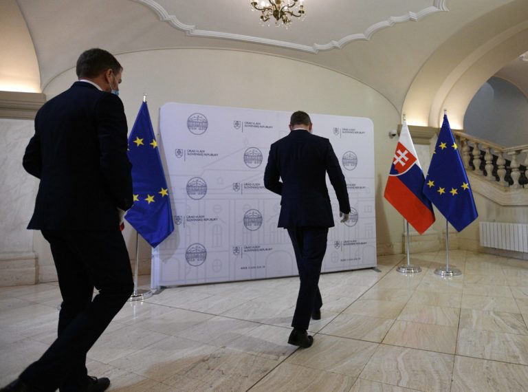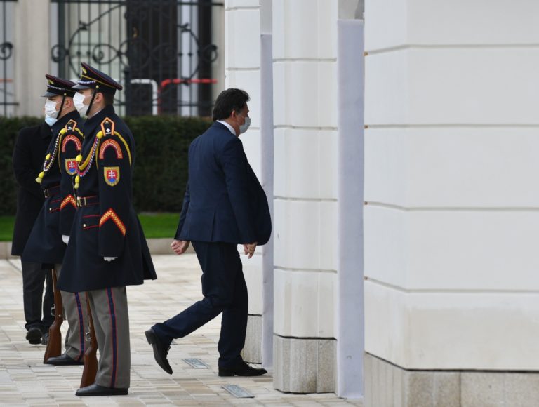 Predseda vlády SR Igor Matovič (vpravo) prichádza na fototermín po vymenovaní novej vlády SR prezidentkou SR v Prezidentskom paláci. Bratislava, 21. marec 2020. Foto: SITA/Ľudovít Vaniher