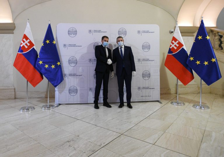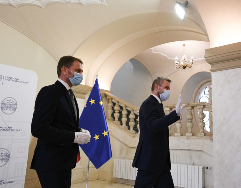 Zľava: Novovymenovaný predseda vlády SR Igor Matovič a bývalý premiér SR Peter Pellegrini pred oficiálnym odovzdaním Úradu vlády novovymenovanému predsedovi vlády SR v starej budove Úradu vlády SR. Bratislava, 21. marec 2020. Foto: SITA/Martin Medňanský