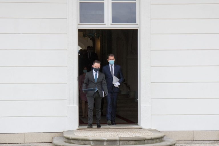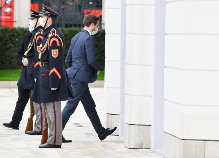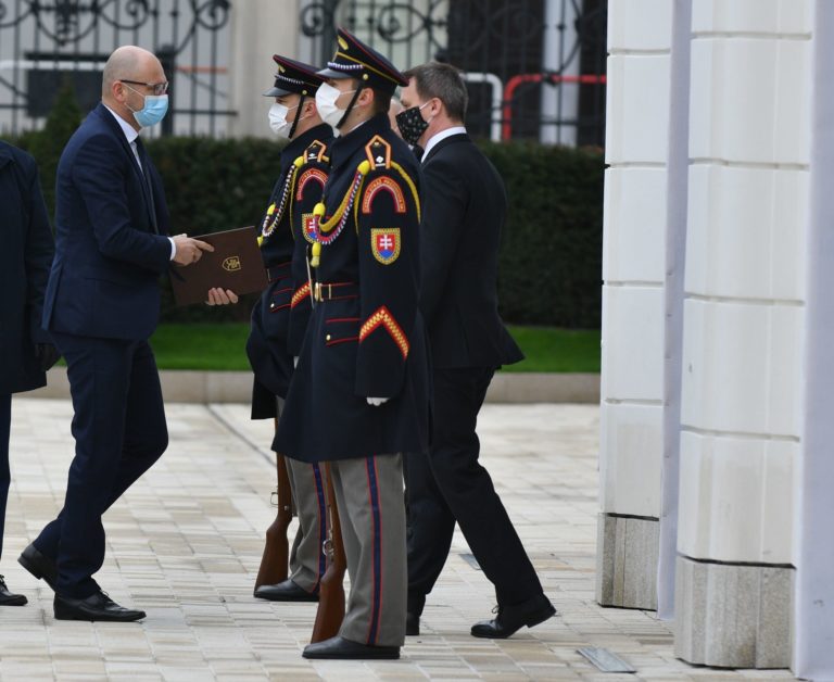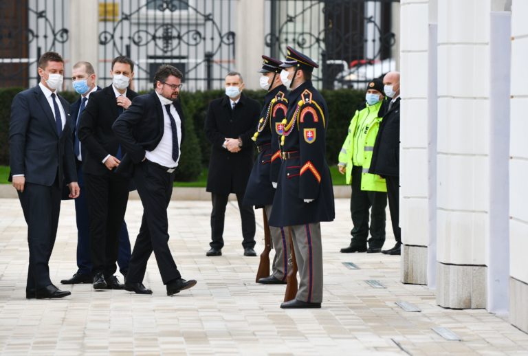 Budúci minister zdravotníctva SR Marek Krajčí (vpravo) počas príchodu do Prezidentského paláca pred vymenovaním novej vlády SR. Bratislava, 21. marec 2020. Foto: SITA/Martin Medňanský
