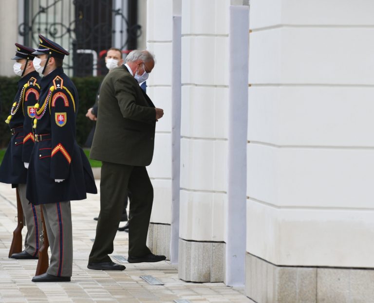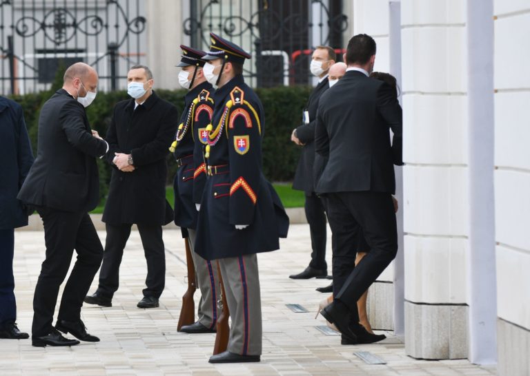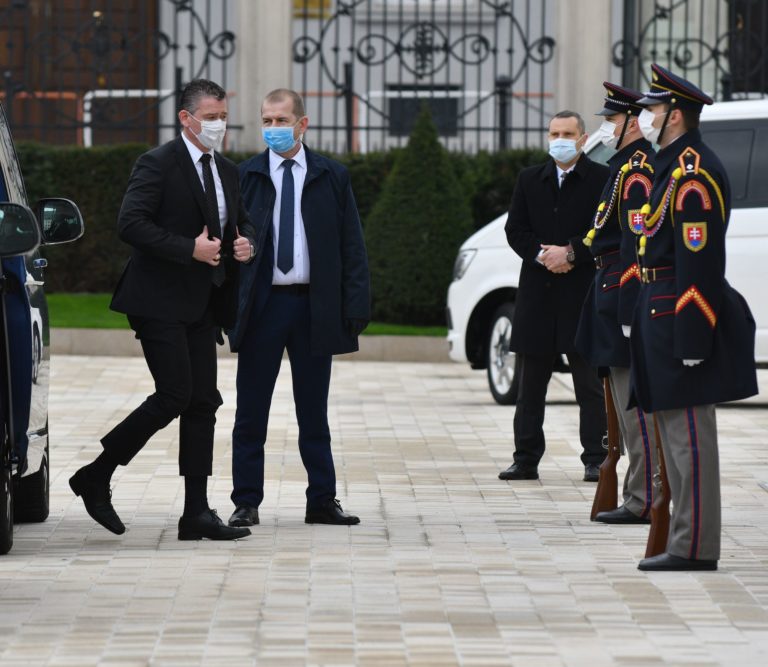 Budúci minister obrany SR Jaroslav Naď (vľavo) počas príchodu do Prezidentského paláca pred vymenovaním novej vlády SR. Bratislava, 21. marec 2020. Foto: SITA/Martin Medňanský